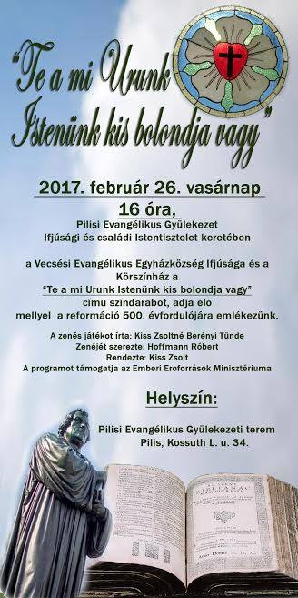 Április 8-án a gitáros istentisztelet keretében mutatjuk be az Életképek Luther életéből című kosztümös darabunkat. Írta: Berényi Tünde, rendezte: Kiss Zsolt. Előadják: Kiss Zsolt, Heinemann Ildikó és az ifjúság tagjai.